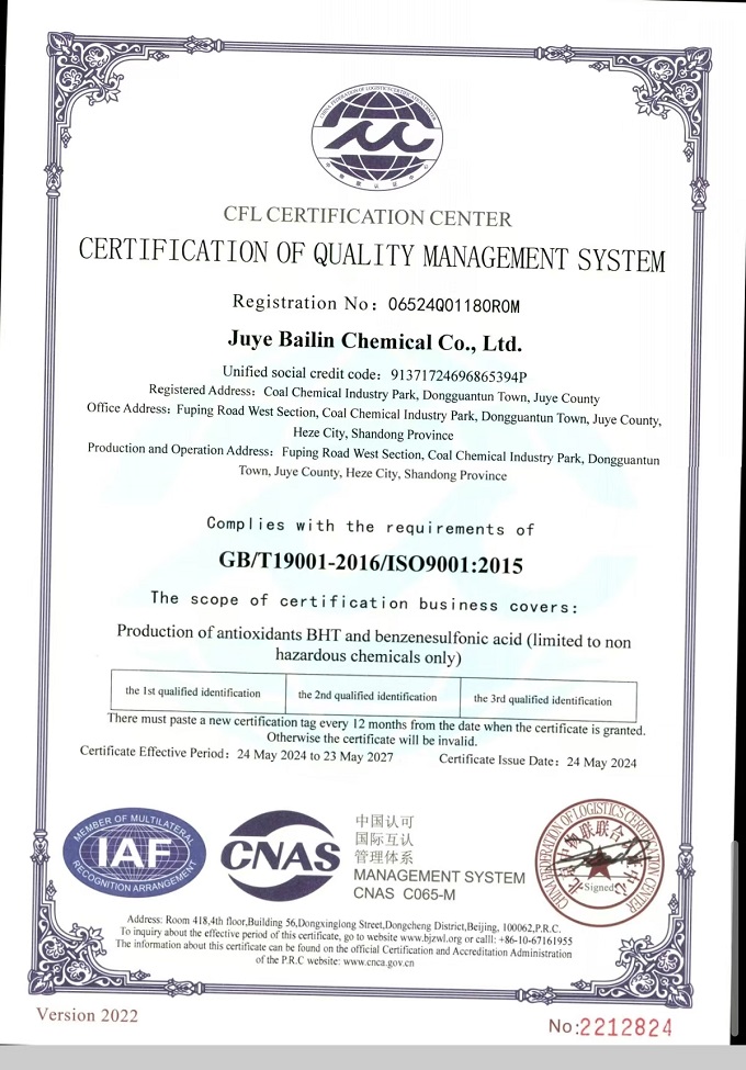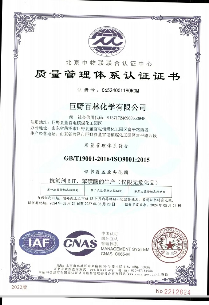 巨野百林化學有限公司質量管理體系認證證書